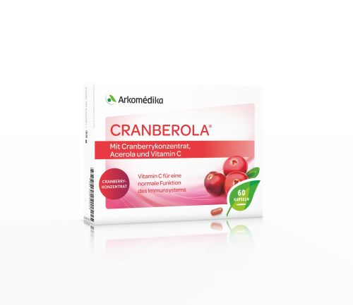 In Cranberola® Kapseln wird ein Cranberrykonzentrat mit Acerolakirschextrakt und Vitamin C kombiniert. Vitamin C trägt zur normalen Funktion des Immunsystems bei.