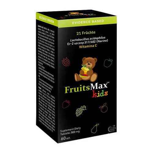 Das Nahrungsergänzungsmitteln FruitMax Kids 500 mg besteht aus pflanzlichen Inhaltsstoffen, Vitamin C und Lactobacillus acidophilus Er-2 Stamm 317/402 Narine. Das Produkt ist für Erwachsene und Kinder ab 3 Jahren bestimmt.