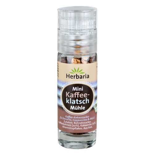 Herbaria Kaffeeklatsch Mini-Mühle ist ein Kaffee-Kakaozucker in bester Bio-Qualität mit den ausgewählten Zutaten Kaffeebohnen, Kakaonibs und Ahornsirupflakes. Die Mischung ist der perfekte Begleiter zu Kaffee & Kuchen. Als Topping auf Kaffeespezialitäten wie z.B. Cappuccino, auf Desserts und Müsli – einfach direkt drübermahlen und genießen! Mit der praktischen Mini-Mühle ideal für unterwegs!