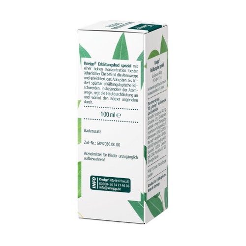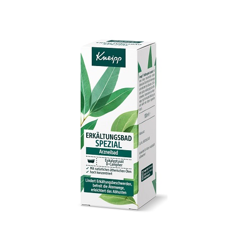 Kneipp® Erkältungsbad spezial. Wirkstoffe: Eukalyptusöl 40,0 g, D-Campher 2,5 g. Badezusatz zur Anwendung bei Erwachsenen und Heranwachsenden ab 12 Jahren. Zur unterstützenden Behandlung und zur Besserung der Beschwerden bei Erkältungskrankheiten der Atemwege mit zähflüssigem Schleim. Enthält D-Campher. Zu Risiken und Nebenwirkungen lesen Sie die Packungsbeilage und fragen Sie Ihre Ärztin, Ihren Arzt oder in Ihrer Apotheke.