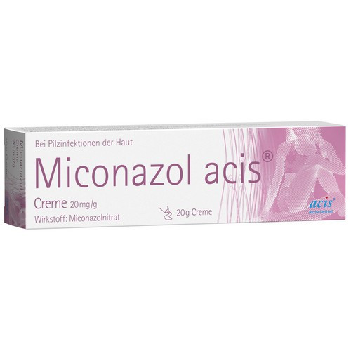 Wirkstoff: Miconazolnitrat, 20 mg/g. Anwendungsgebiete: Zur Therapie von Mykosen der Haut und Hautfalten, Interdigitalmykosen, oberflächliche Kandidosen. Miconazol acis Creme wird angewendet bei Säuglingen, Kindern u. Erwachsenen. Warnhinweise: Enthält Benzoesäure. Zu Risiken und Nebenwirkungen lesen Sie die Packungsbeilage und fragen Sie Ihre Ärztin, Ihren Arzt oder in Ihrer Apotheke. Stand: 09/2025.