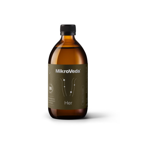Wasser, Glänzender Lackporling (Reishi), Traubenkernmehl, Bärentraubenblätter, Frauenmantel, Rosmarin, Rotkleeblüten, Salbei, Schafgarbe, MikroVeda Mikroorganismenkomplex bestehend aus Bacillus clausii, Bacillus subtilis, Bifidobacterium adolescentis, Bifidobacterium lactis, Bifidobacterium bifidum, Bifidobacterium breve, Bifidobacterium longum, Bifidobacterium infantis, Enterococcus faecium, Lactobacillus acidophilus, Lactobacillus amylolyticus, Lactobacillus amylovorus, Lactobacillus casei 01 Lactobacillus casei 02, Lactobacillus casei 03, Lactobacillus crispatus Lactobacillus delbrueckii subsp. bulgaricus, Limosilactobacillus fermentum 20, Lentilactobacillus farraginis, Lactobacillus gasseri, Lactobacillus helveticus, Lacticaseibacillus paracasei subsp. Paracasei Lactobacillus paracasei, Lactobacillus johnsoni, Lentilactobacillus parafarraginis, Lactiplantibacillus plantarum subsp. Plantarum Limosilactobacillus reuteri, Lacticasei bacillus rhamnosus, Ligilactobacillus salivarius, Lactocaseibacillus zeae, Lactococcus lactis 01 Lactococcus lactis 02, Lactococcus lactis 03, Saccharomyces cerevisiae Streptococccus thermophilus