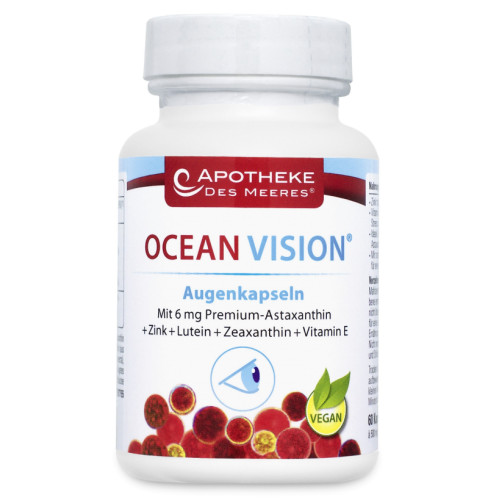 Sonnenblumenöl, Astaxanthin-Öl mit Astaxanthin aus der Mikroalge Hamatococcus pluvialis, Lecithin (aus GMO-freien Sonnenblumen), Lutein (aus Tagetes erecta), Vitamin E aus Sonnenblumen, Zink, Zeaxanthin (aus Tagetes erecta), vegane Kapselhülle: Hydroxypropylmethylcellulose