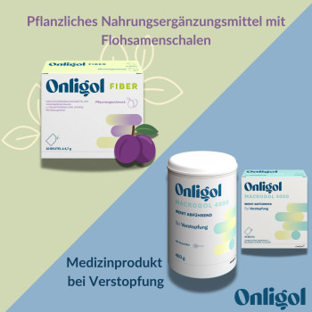 Da Flohsamenschalen die Aufnahme von Medikamenten im Darm verzögern können, sollte zwischen der Einnahme von Onligol Fibre und der Einnahme von Medikamenten ein Zeitraum von mindestens 2 Stunden liegen. Eine Packung Onligol Fiber mit Pflaumengeschmack enthält 20 Beutel à 4,7 g.