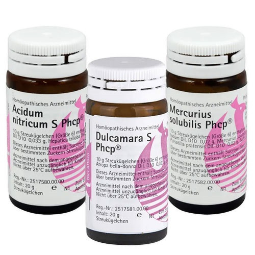 Eine mögliche Dosierung ist die Einnahme im 3-tägigen Wechsel über 90 Tage hinweg. Zunächst werden drei Tage lang Mercurius Solubilis Globuli eingenommen, anschließend drei Tage lang Dulcamara Globuli und schließlich drei Tage lang Acidum Nitricum Globuli.