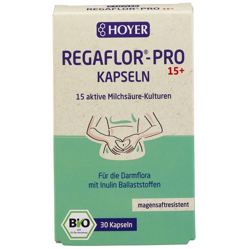 REGAFLOR-PRO 15+ Bio-Kapseln enthalten neben den 3 Milliarden aktiven Kulturen (2 Streptococcus-, 4 Bifido- und 9 LactobaciIlus-Bakterienstämme) auch Bio-Inulin als Ballaststoff für die Darmflora.